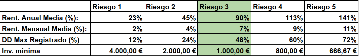 Las configuraciones Agresiva (Perfil de riesgo agresivo 141%), Moderada (Perfil de riesgo moderado, 90%) y Conservadora (Perfil de riesgo conservador, 23%) son ejemplos de carteras tipo basado en datos históricos y rentabilidades potenciales. En cualquier caso el usuario podrá y deberá adaptar el robot según su perfil de inversión y preferencias.