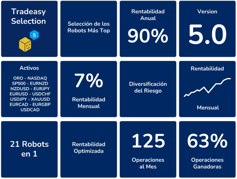 En resumen, una selección de los sistemas automáticos más prometedores de entre todos los sistemas creados en tradEAsy que han sido elegidos de entre más de 400 robots creados y mejorados por el equipo de tradEAsy y una comunidad de más de 300 traders.